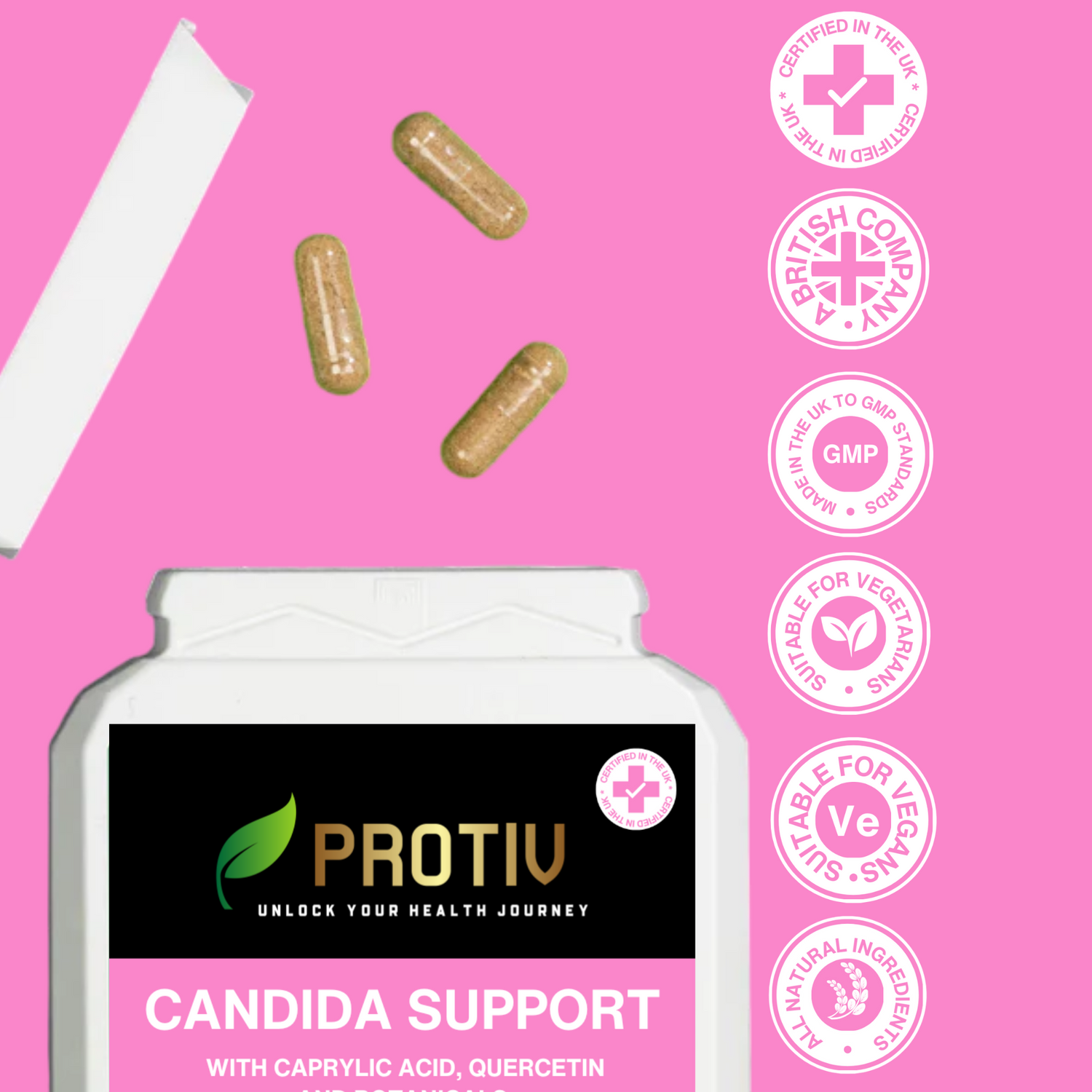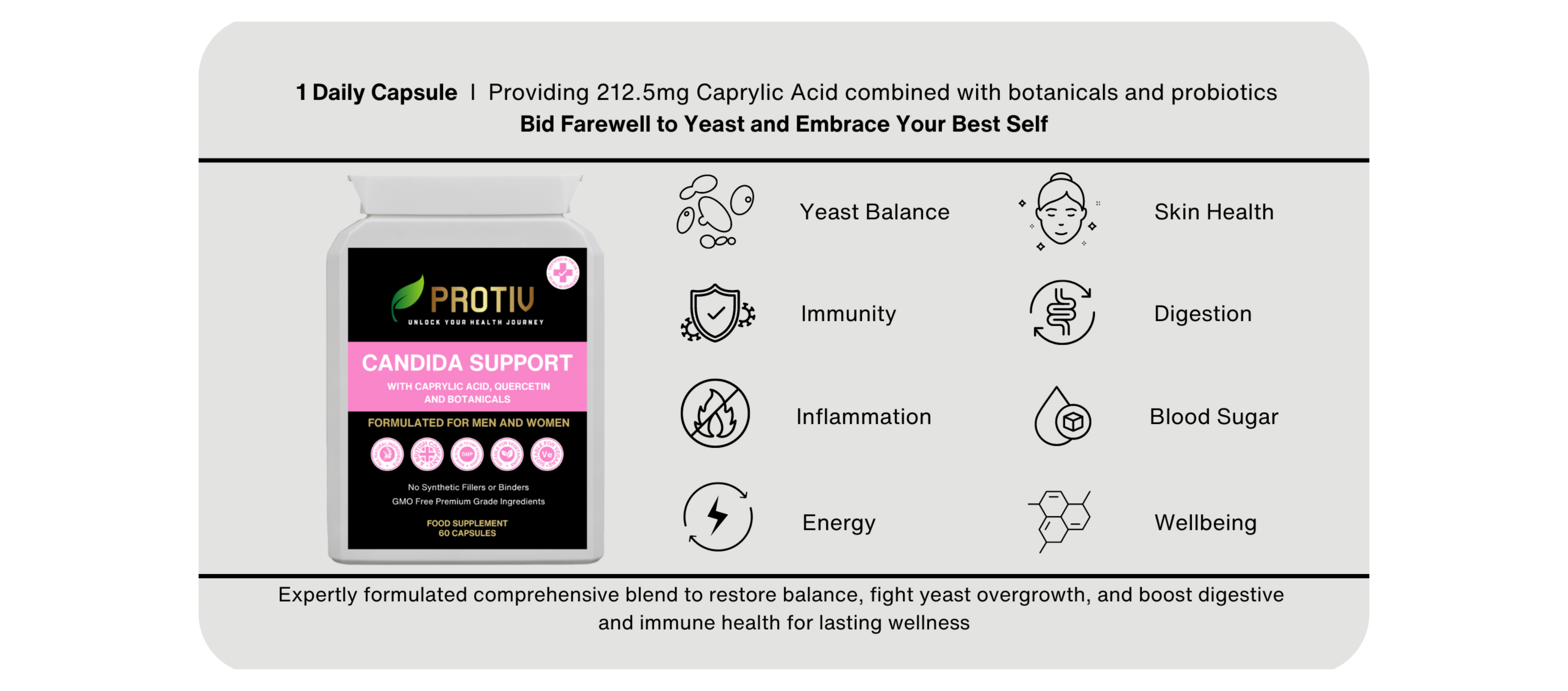 A perfect balance of Caprylic Acid, ProBiocultures & Herbals to help maintain a healthy balance of yeast and fight off candida overgrowth.