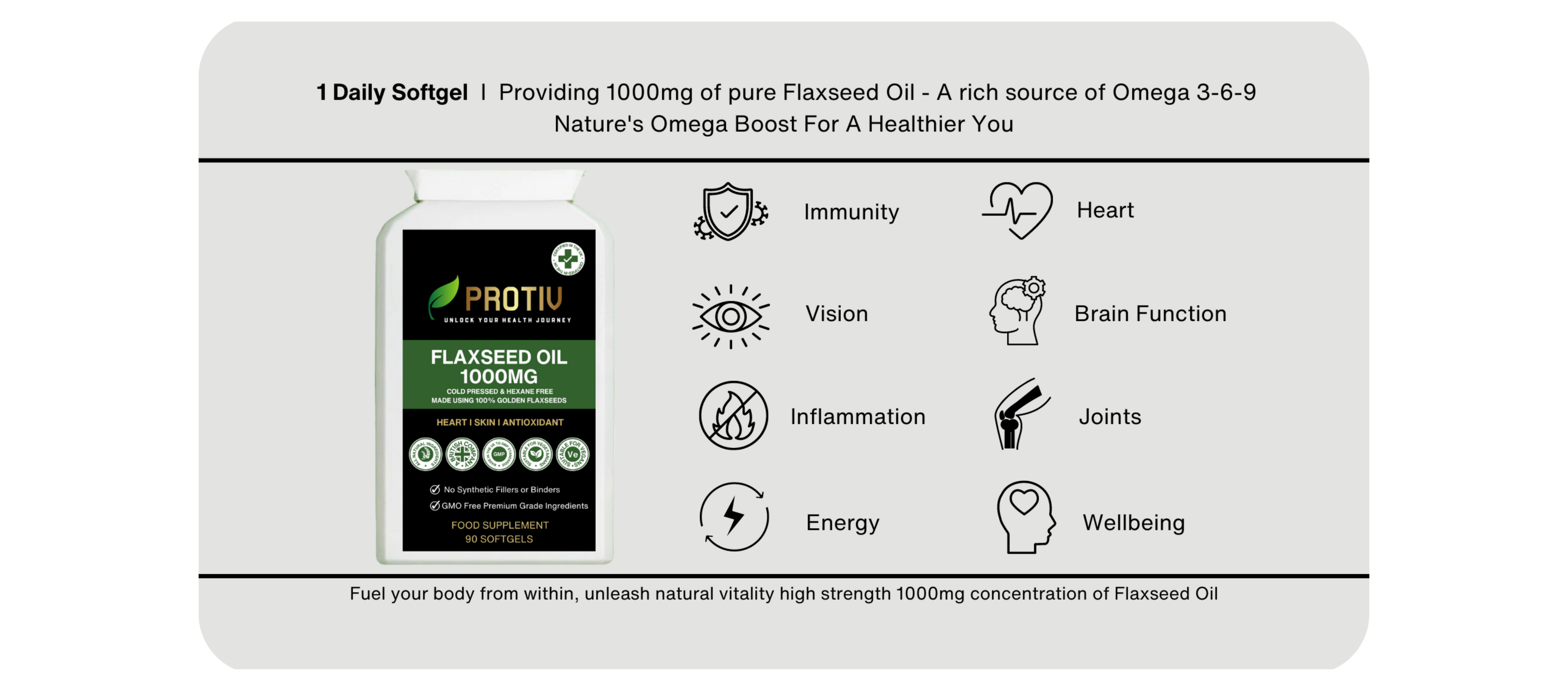 A plant based source of Omega-3 fatty acids, especially Alpha-Linolenic Acid (ALA), to support heart, brain function, and overall wellbeing. Delivering a 1000mg potent dosage in each capsule that helps to promote healthy skin, joints and reduce inflammation.