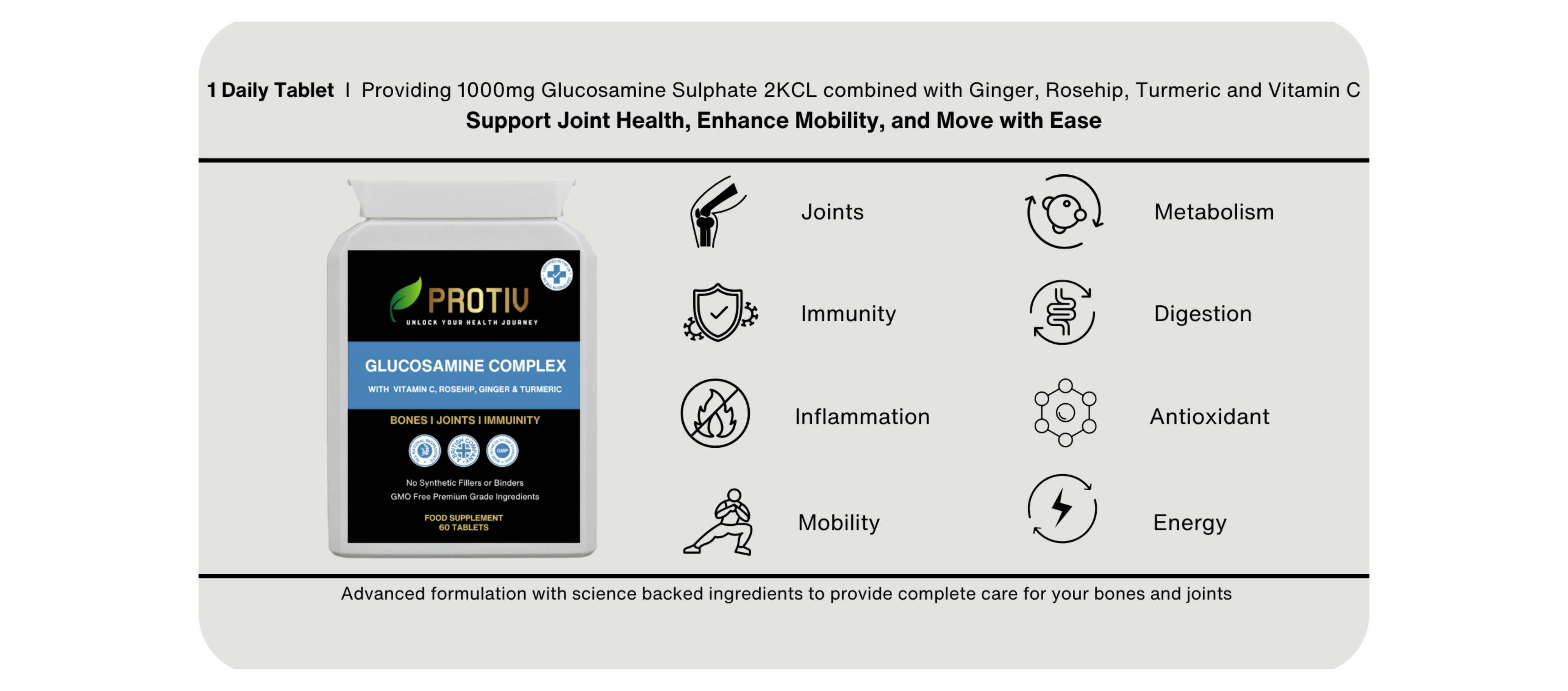 - Glucosamine Sulphate helps maintain healthy cartilage, essential for smooth joint movement and flexibility.