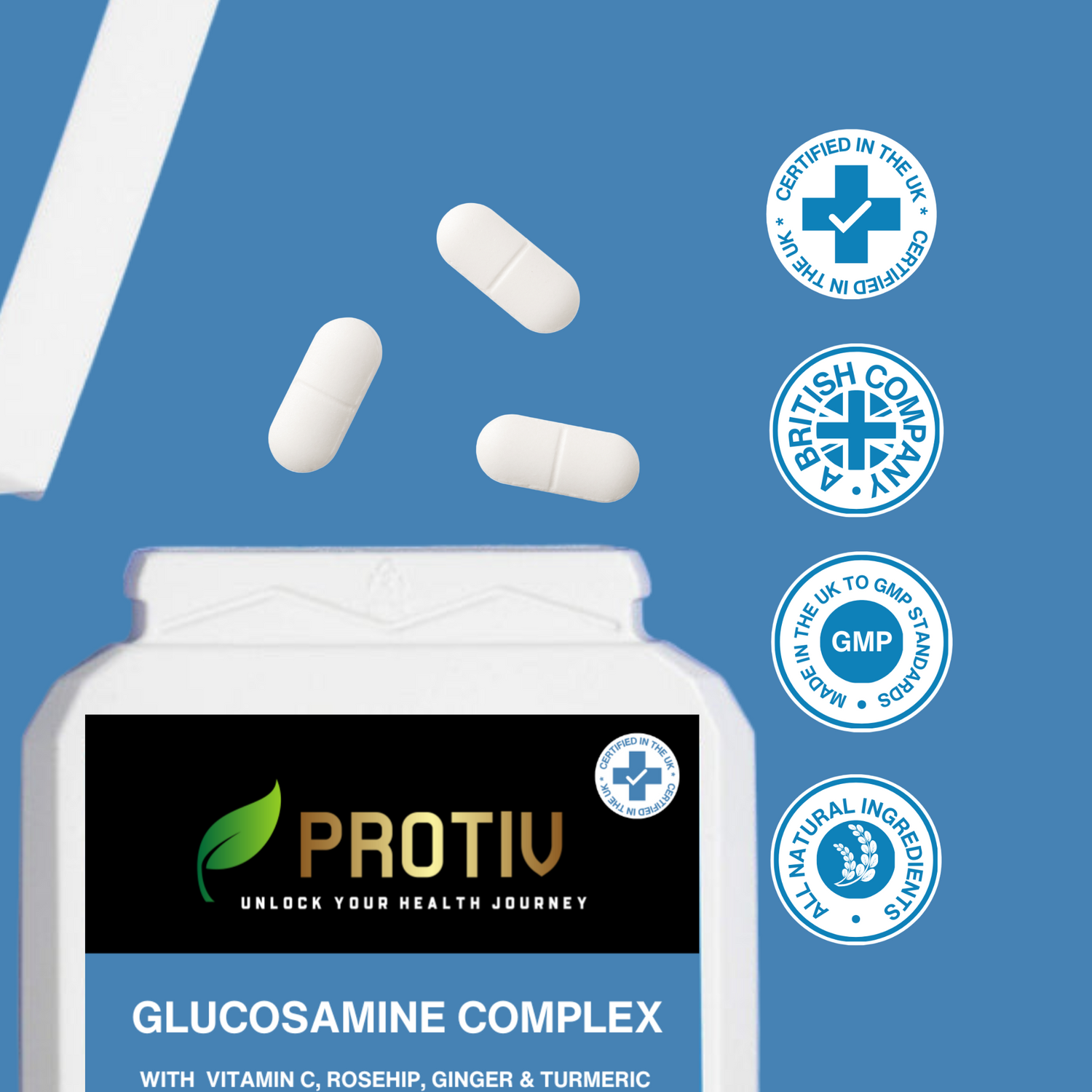 We recommend taking 1 tablet of our Glucosamine Complex every day, ideally with food and water. Each bottle contains 60 tablets.