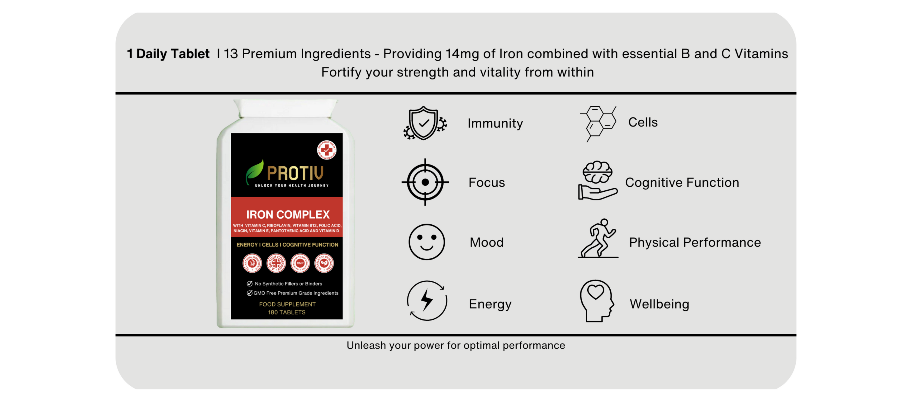 Providing an optimum dose of 14mg of iron per serving our advanced complex also contains Vitamin C, Vitamin D3 and all essential B Vitamins making it a holistic blend for overall wellness.