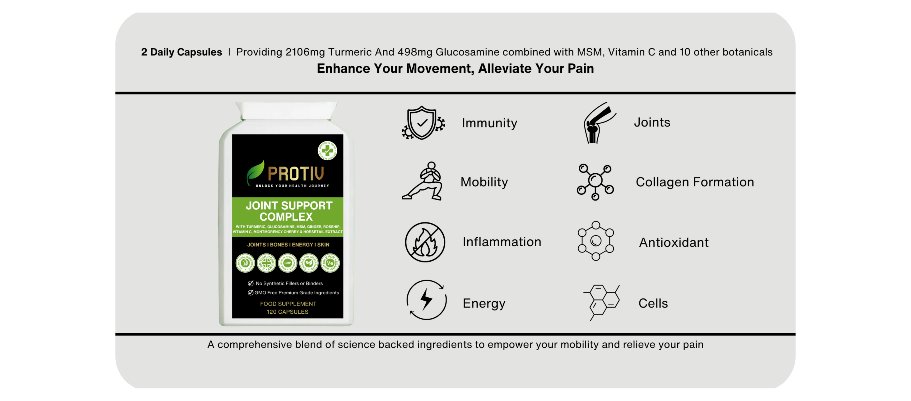 A specialized dietary supplement designed to promote joint health and mobility. Our advanced complex works synergistically to provide comprehensive support for joint function, reduce discomfort, and promote overall mobility, making it an excellent choice for those seeking to maintain and improve joint health.